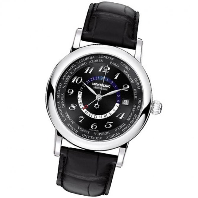 Корпус круглой формы и изготовлен из нержавеющей стали диаметром 42 мм и толщиной 12,6 мм. Имеют механизм с автоподзаводом в котором использован 21 камень, частота - 28800 полуколебаний в час. Запас хода - 42 часа. Стрелки с родиевым напылением. Индикатор даты реализован в виде вращающегося диска. Украшающий чёрный циферблат модели Star World-Time GMT Automatic имеет изысканный гильошированный узор в виде эмблемы Montblanc воплощает собой поразительное величие высочайшей горы Альпийского массива. На внешней часовой шкале циферблата представлены названия городов, обозначающих 24 часовых пояса. Задняя крышка прозрачная, из сапфирового стекла. Крепится на 6-ти винтах. Браслет из кожи аллигатора чёрного цвета, с раскладывающейся застёжкой из нержавеющей стали. Водонепроницаемость до 30 метров. Запатентованная система позволяет обладателю часов с помощью заводной головки управлять всеми функциями. Благодаря специальному механизму настройки местное время легко устанавливается без нарушения точности хода часов. Модель Star World-Time GMT Automatic была удостоена Женевского Гран-При Высокого часового искусства в категории "Маленькая стрелка".