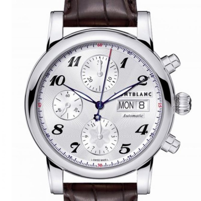 Модель Montblanc Star Chronograph Automatic является виртуозным примером решения сложных технических задач. Часы наглядно доказывают, что самое незначительное уменьшение формата зачастую влечёт за собой серьёзные дизайнерские и функциональные усовершенствования. В круглом корпусе из нержавеющей стали диаметром 39 мм и толщиной 13,95 мм установлен крупный циферблат с гармонично размещёнными разнообразными дополнительными функциями. 30-ти минутный и 12-ти часовой счётчики увеличенного размера придают особую выразительность вертикальной оси, плавно переходящей в браслет. В механизме использовано 25 камней. Частота - 28800 полуколебаний в час. Запас хода около 46 часов. Имеют белый посеребрённый циферблат с цифрами чёрного цвета. Люминисцентные стрелки в форме листьев и палочек из воронёной стали. Циферблат малой секундной стрелки находится в положении 9 часов с утончёнными десятисекундными метками является образцом сдержанности. Стрелка хронографа с красным наконечником и оформившей противоположный конец перфорированной эмблемой Montblanc перемещается над всей поверхностью циферблата. Задняя крышка прозрачная, из сапфирового стекла и крепится на 6-ти винтах. Браслет из кожи аллигатора коричневого цвета. Застёжка - раскладывающаяся из нержавеющей стали. Герметичность до 30 метров (3 бар).