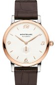 Часы Montblanc Star Classique Automatic отличаются совершенной, лаконичной и утонченной формой. Изысканные нюансы отделки ложатся в основу благородного классического стиля, ставшего идеальным воплощением элегантной экстравагантности. В часах Star Сlassique Automatic с необычайно тонким корпусом минималистская индикация времени отражает непревзойденный уровень швейцарского часового мастерства. Корпус круглой формы, изготовлен из нержавеющей стали. Диаметр и толщина 39 мм и 8,9 мм соответственно. В кварцевом механизме использовано 27 камней. Черный циферблат с цифрами и индикаторами с напылением желтого золота. Выпуклое сапфировое стекло сделано с двойным антибликовым покрытием. Стрелки представлены в форме листьев с напылением желтого золота. Задняя крышка из желтого золота 18К с сапфировым стеклом. Ремешок черный из кожи аллигатора. Герметичность до 30 метров (3 бар).