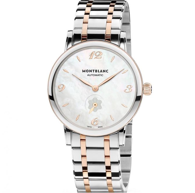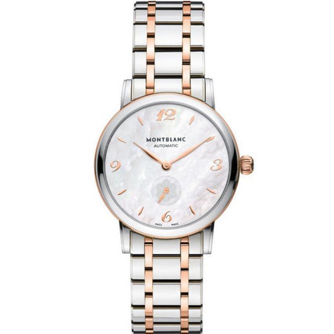 Модель отличается совершенной, лаконичной и утонченной формой. Изысканные нюансы отделки ложатся в основу благородного классического стиля, ставшего идеальным воплощением элегантной экстравагантности. В часах Star Сlassique Lady Automatic с необычайно тонким корпусом минималистская индикация времени отражает непревзойденный уровень швейцарского часового мастерства. Корпус круглой формы, изготовлен из нержавеющей стали. Диаметр и толщина 34 мм и 8,98 мм соответственно. В кварцевом механизме использовано 27 камней. Белый перламутровый циферблат, метки и цифры с напылением розового золота. Стрелки представлены в форме листьев с напылением розового золота. Выпуклое сапфировое стекло с двойным антибликовым покрытием. Задняя крышка из нержавеющей стали с сапфировым стеклом. Имеется тройная раскладывающаяся застежка из нержавеющей стали из розового золота 18К. Герметичность до 30 метров (3 бар).