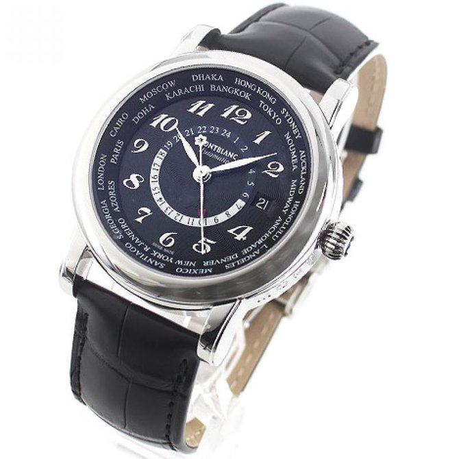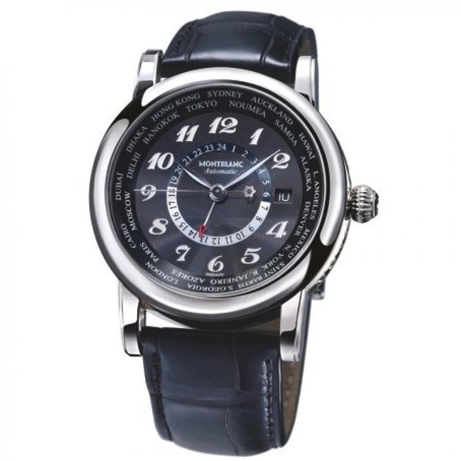 Украшающий циферблат модели Star World-Time GMT Automatic изысканный гильошированный узор в виде эмблемы Montblanc воплощает собой поразительное величие высочайшей горы Альпийского массива. На внешней часовой шкале циферблата представлены названия городов, обозначающих 24 часовых пояса. Запатентованная система позволяет оюладателю часов с помощью заводной головки управлять всеми функциями. Благодаря специальному механизму настройки местное время легко устанавливается без нарушения точности хода часов. Модель Montblanc Star World-Time GMT Automatic была удостоена Женевского Гран-При Высокого часового искусства в категории "Маленькая стрелка"