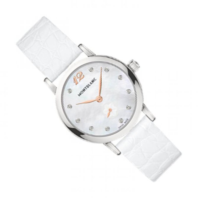 Элегантный облик часов Star Сlassique Lady подчеркнут женственным перламутровым циферблатом с бриллиантовыми метками и характерной арабской цифрой 12. Индикатор малой секундной стрелки украшен гильошированным узором в виде эмблемы Montblanc. Высокоточный кварцевый механизм заключен в исключительно тонкий 30 мм корпус с филигранно исполненными ушками и эргономично изогнутой задней крышкой. Диаметр и толщина 30 мм и 7.36 мм соответственно. В кварцевом механизме использовано 4 камня. Белый перламутровый циферблат, имеющий цифры на котором напыление с розового золота, метки с 11 бриллиантами Top Wesselton (около 0.071 карата). Стрелки представлены в форме листьев с напылением розового золота. Задняя крышка из нержавеющей стали. Выпуклое сапфировое стекло с антибликовым покрытием. Ремешок из кожи аллигатора. Герметичность до 30 метров (3 бар).