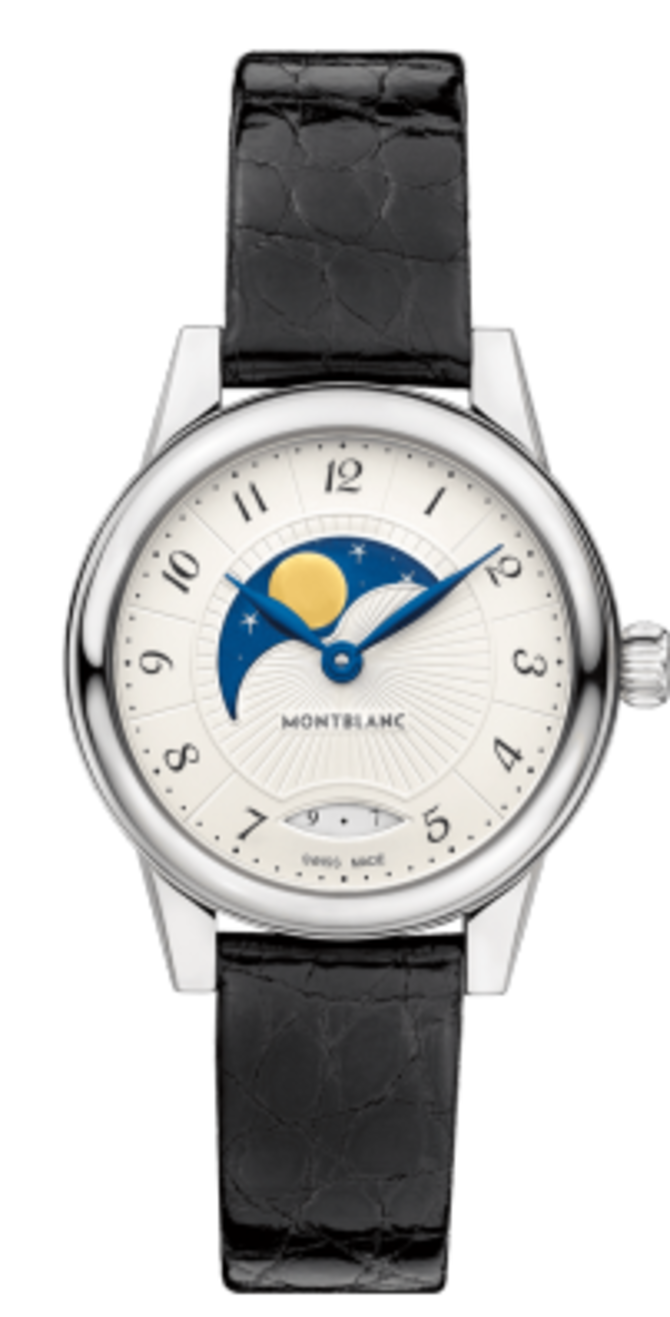 Миниатюрные швейцарские часы Montblanc были выпущены в стальном полированном корпусе, диаметром всего 27 миллиметров. Модель Montblanc Bohème Moonphase Quartz 27 mm функционирует на базе кварцевого мануфактурного механизма MB 21.13, обеспечивающего владельца индикацией времени стальными стрелками из вороненой стали синего цвета, а также индикацией лунных фаз. Циферблат надежно закрыт сапфировым стеклом с противобликовым покрытием. Ремешок черного цвета из лакированной крокодиловой кожи в комплекте. Водонепроницаемость корпуса составляет 30 метров.