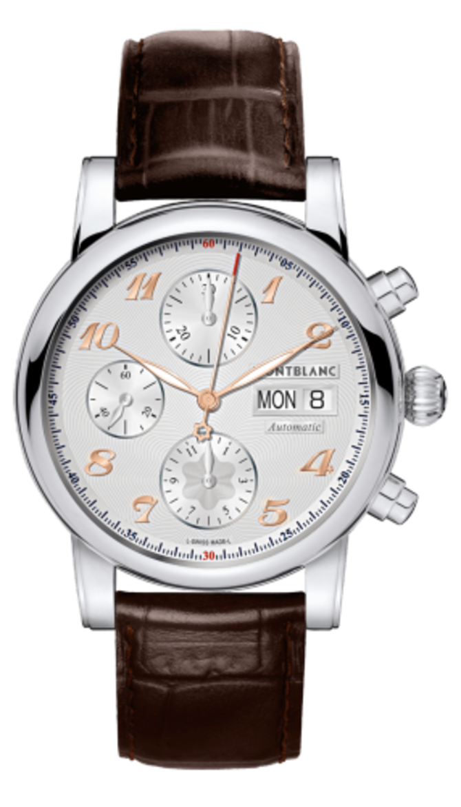 Элегантные и стильные наручные часы от швейцарской часовой мануфактуры Montblanc - модель Star Traditional Chronograph Automatic "Carpe Diem Edition", оснащенная функцией хронографа. На циферблате часов установлены накладные арабские цифры из розового золота, изготовленные в стиле Breguet. Также из золота сделаны стрелки часов; часовая и минутная покрыты люминесцентным составом белого цвета, который светится при плохом освещении. Дополнительной элегантности этим часам придает коричневый ремешок из натуральной кожи аллигатора с классической пряжкой в комплекте.