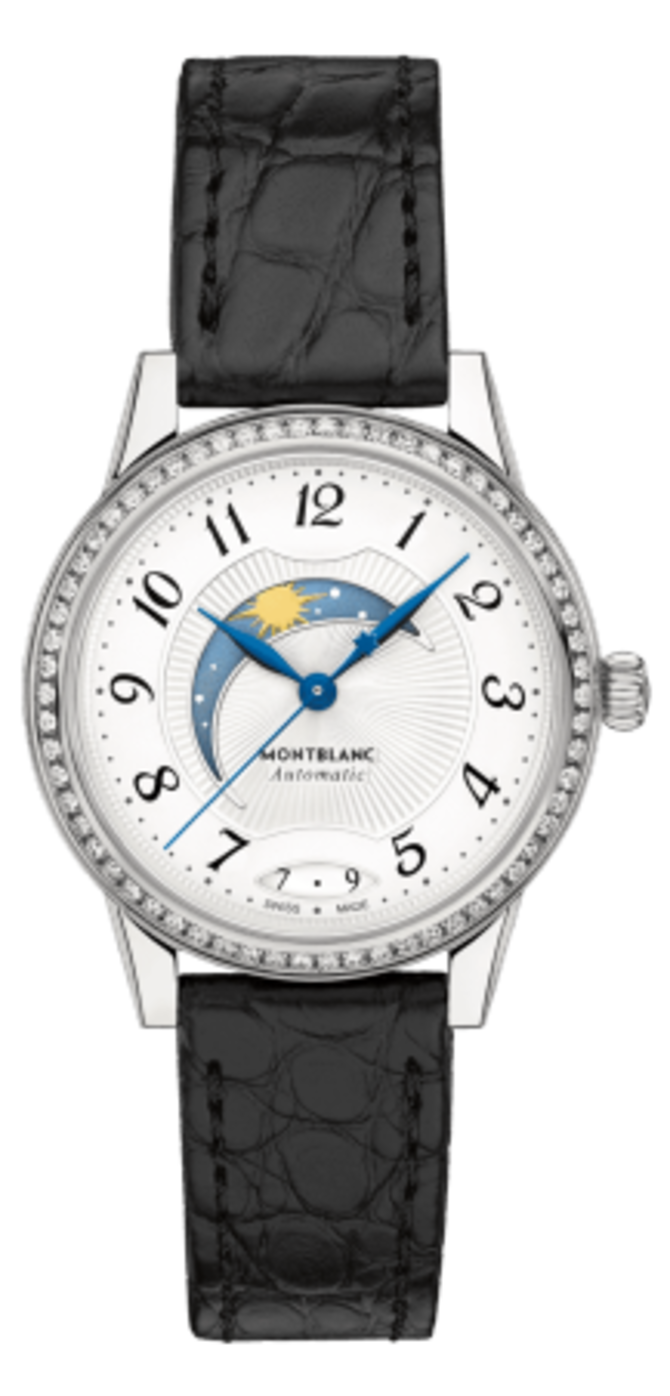 Данная версия женских наручных часов Montblanc украшена множеством драгоценных камней, а именно белыми бриллиантами классической огранки, установленными на безеле. Циферблат с индикатором фаз луны закрыт сапфировым стеклом с антибликовым покрытием. Ремень, который идет в комплекте к данной модели, пошит из натуральной крокодиловой кожи - ручная работа. Автоматический калибр разработки Montblanc отвечает за индикацию часов, минут, секунд и фаз луны. Корпус имеет водонепроницаемость, рассчитанную на погружение под воду не глубже 30 метров.