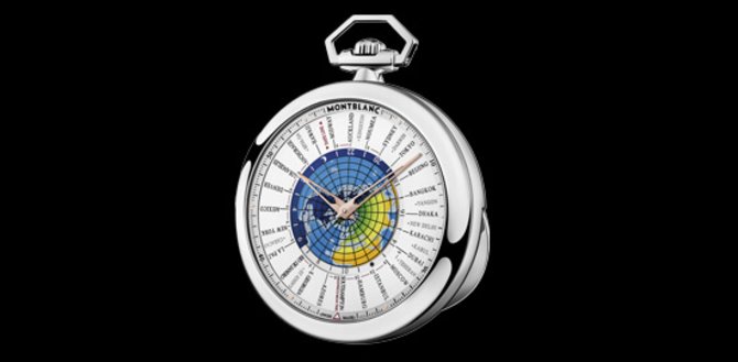 На известной мировой выставке часового мастерства SIHH в 2016 году часовая мануфактура Montblanc представила множество инновационных часовых разработок. В это число попала новая модель швейцарских карманных часов Montblanc 4810 Orbis Terrarum Pocket Watch 110 years Edition. Из названия новинки можно догадаться, что модель карманных часов выпускается лимитированной серией из 110 экземпляров. Часы функционируют на автоматическом мануфактурном швейцарском механизме с функцией индикации мирового времени и индикатором дня и ночи. Кроме основных часовых усложнений, на часовом циферблате указываются часы и минуты. Корпус изготовлен из нержавеющей стали. Его размеры: 53 мм - диаметр; 16.80 мм - толщина. Герметичность - 50 метров. Циферблат накрыт сапфировым стеклом. Доукомплектована модель стальной цепочкой.