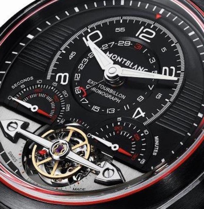 Новая модель механических наручных часов от компании Montblanc, выпущенная лимитированной серией из 100 экземпляров, представлена в круглом титановом корпусе с DLC-покрытием, диаметром 44 миллиметра и толщиной 16 миллиметров. Внутри корпуса расположен автоматический калибр MB R230 с турбийоном (запатентованный ExoTourbillon, созданный на мануфактуре Montblanc) и функцией хронографа. Герметичность корпуса высокая - 100 метров. На спортивном гильошированном циферблате черного цвета указываются часы, минуты, секунды и дата. Запас хода механизма - 50 часов. Также механизм обладает функцией остановки секунд.