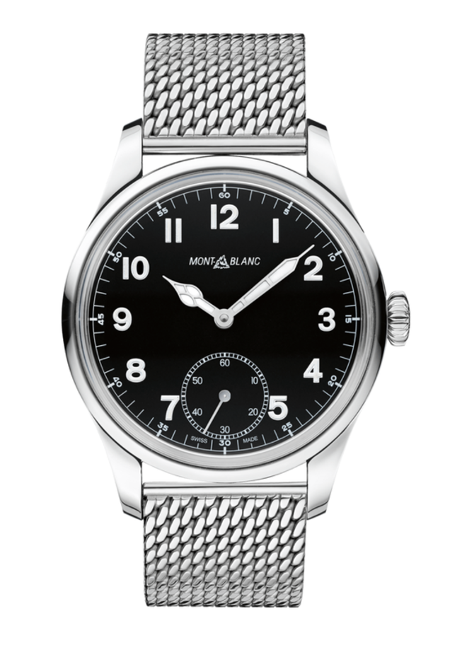 Популярная швейцарская часовая компания Montblanc, также известная благодаря своим пишущим инструментам, представила свою новую модель - наручные часы в корпусе из нержавеющей стали, вошедшие в коллекцию "Villeret 1858". Часовой ряд международной марки Montblanc представлен в более чем 70 странах мира. Представленные часы успешно функционируют на мануфактурном механизме с ручным подзаводом, Калибр MB 23.03. Особенность калибра - 46-часовой запас хода. На черном часовом циферблате указываются часы, минуты и секунды. Корпус модели обладает такими габаритами: 44 х 10.95 мм. Циферблат закрыт сапфировым стеклом. Задняя крышка также из сапфирового стекла. Укомплектованы часы стальным браслетом с раскладывающейся застежкой. Герметичность корпуса - 30 метров. Модель выполнена в винтажном стиле.