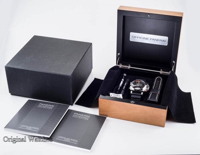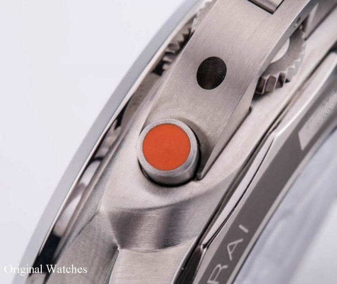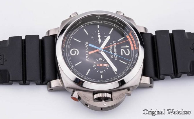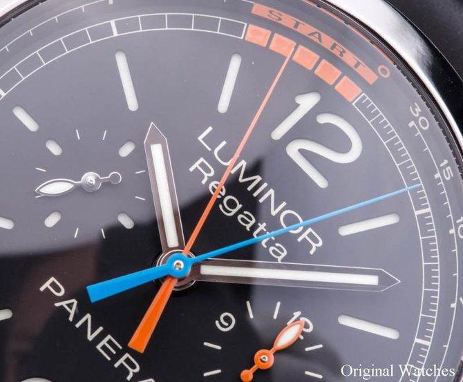 СТАРТ РЕГАТЫ СТАРИННЫХ ЯХТ – ПОИСТИНЕ ЗАВОРАЖИВАЮЩЕЕ ЗРЕЛИЩЕ. Судна выстраиваются на старте между буями, на данном этапе все зависит от ветра, опыта капитана и его команды. Хронометраж имеет первоочередное значение. Обратный отсчет оставшихся до начала заплыва минут ведется по заведенному ритуалу с использованием флажков. Участники должны выстроиться, не пересекая до старта воображаемую линию. Модель Luminor 1950 Regatta 3 Days Chrono Flyback Titanio была создана благодаря союзу компании Officine Panerai с миром парусного спорта. Хронограф с автоматическим механизмом и трехдневным запасом хода оснащен функцией обратного отсчета Regatta, специально разработанной для измерения времени, оставшегося до старта парусной регаты. Необычайно простая в использовании функция обратного отсчета Regatta свидетельствует о совершенстве инновационного автоматического калибра P.9001R с функцией хронографа, установленного в модели Luminor 1950 Regatta 3 Days Chrono Flyback Titanio. Оранжевая кнопка в положении «4 часа» позволяет скачкообразно перемещать центральную оранжевую минутную стрелку хронографа в обратном направлении с одного деления на другое, устанавливая таким образом продолжительность обратного отсчета. При запуске хронографа путем нажатия кнопки запуска/остановки в положении «10 часов» стрелки хронографа начинают перемещаться, указывая оставшиеся до старта минуты и секунды. После окончания обратного отсчета они начинают отмерять время, истекшее с момента начала гонки. Кнопка в положении «8 часов» используется для прекращения хронометража и обнуления показаний. При нажатии данной кнопки без предварительной остановки стрелок активируется функция «flyback», позволяющая незамедлительно начать новый отсчет временного промежутка без остановки и возврата стрелок в исходное положение с помощью других кнопок. Черный циферблат модели Luminor 1950 Regatta 3 Days Chrono Flyback Titanio с характерной двухслойной конструкцией оформлен в классическом стиле Panerai.
