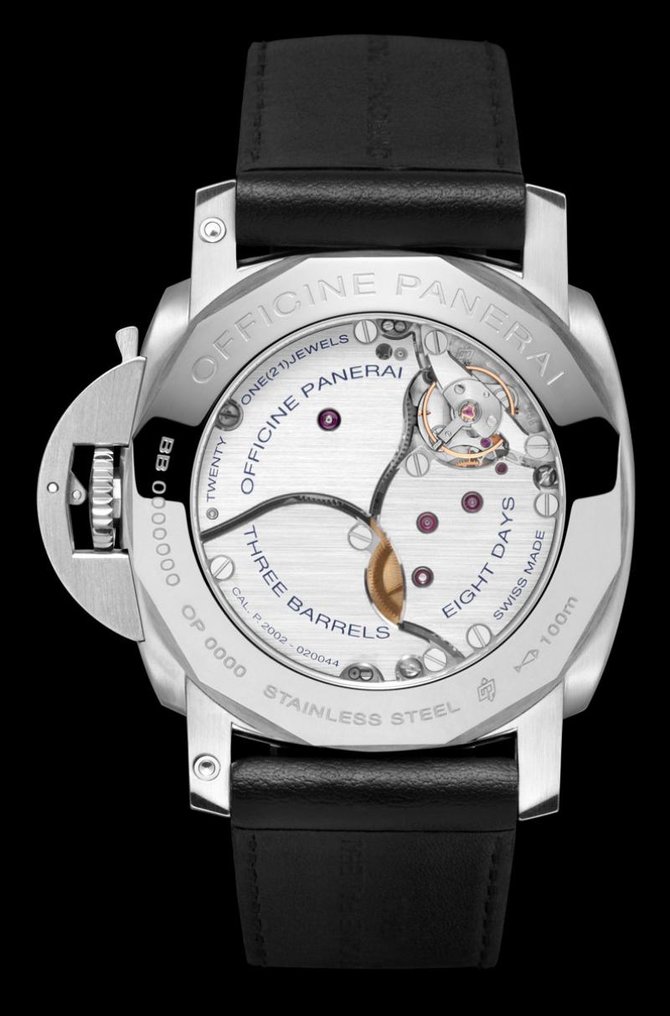 Часы оснащены калибром Р.2002 из серии Р.2000, названнным в честь года начала разработки фирменных калибров Panerai, полностью спроектированных