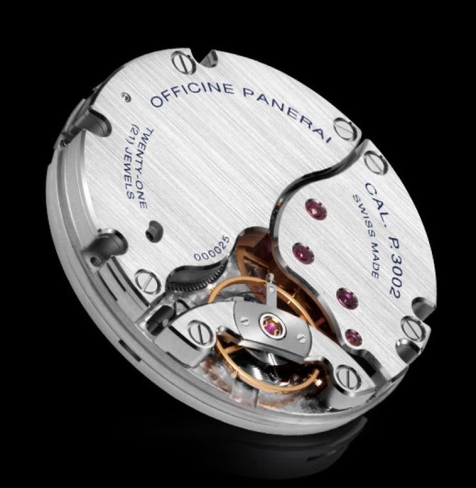Luminor 1950 3 Days Power Reserve оснащены новым калибром P.3002 мануфактурного производства. Диаметр калибра 16½ линий отличаются стандартной конструкцией крупных мостов, наличием двух заводных барабанов, обеспечивающих трехдневный запас хода, и балансового колеса диаметром 13,2 мм с переменным моментом инерции, позволяющего осуществлять настройку часов с помощью расположенных снаружи винтов. калибр также имеет систему установки секундной стрелки на ноль и устройство быстрой корректировки времени, позволяющее скачкообразно переводить часовую стрелку с одного часового деления на другое независимо от минутной стрелки без нарушения работы механизма часов.