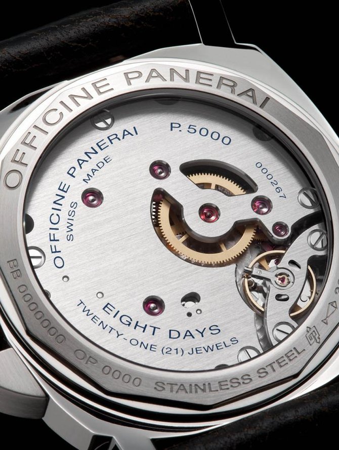 ВОСЬМИДНЕВНЫЙ ЗАПАС ХОДА ЯВЛЯЕТСЯ НЕОТЪЕМЛЕМОЙ ЧАСТЬЮ ИСТОРИИ OFFICINE PANERAI. В конце 1940-х и в начале 1950-х годов марка Panerai использовала калибр Angelus, 16 линий, который должен был идеально функционировать без подзавода в течение восьми дней. Часы с таким долгосрочным запасом хода были созданы для бойцов спецподразделений итальянских ВМС, которым во время операций требовался надежный и совершенный инструмент для измерения времени. Сегодня эта традиция возрождается в калибре P.5000 – современном механизме с ручным заводом и 8-дневным запасом хода, оснастившим часы Luminor Marina 8 Days. Новая модель выполнена с соблюдением эстетических принципов серии Luminor Marina, отличающейся минималистским дизайном корпуса и циферблата часов. Корпус диаметром 44 мм с легко узнаваемым защитным устройством заводной головки с фиксирующим рычагом в форме полумесяца изготовлен из нержавеющей стали AISI 316L. Состоящий из двух наложенных друг на друга дисков черный циферблат обеспечивает максимальную читаемость показаний благодаря крупным часовым меткам в форме рисок, цифрам и малой секундной стрелке в положении «9 часов». Механический калибр P.5000 с ручным заводом, видимый через сапфировое стекло на задней крышке, полностью разработан и изготовлен на Мануфактуре Officine Panerai в Невшателе. Этот механизм диаметром 15¾ линий и толщиной 4,5 мм представляет собой необыкновенно прочную конструкцию. Большая платина с матовой поверхностью и скошенными кромками с алмазной полировкой почти полностью скрывает механизм, однако позволяет видеть баланс с переменным моментом инерции, частота колебаний которого составляет 21 600 полуколебаний в час. Последовательное соединение двух заводных барабанов обеспечивает 8-дневный запас хода. Модель Luminor Marina 8 Days (PAM00510) дополняет ремешок из черной кожи. Эти часы входят в коллекцию Historic Collection.