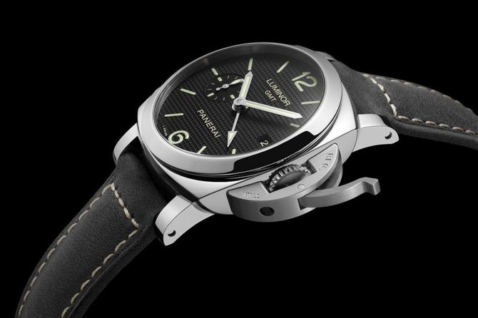 Компания Officine Panerai презентует новинку 2014 года - мужские часы Luminor 1950 3 Days GMT Automatic Acciaio с автоматическим механизмом, калибр P.9002, запас хода - 3 дня, с функциями часов, минут, даты. Диаметр стального корпуса - 42 мм. Люди, которые часто путешествуют, безусловно оценят функцию двойного времени. Апертура даты расположена на 3-х часовой отметке, малая секундная стрелка - на 9-ти часовой отметке. Водонепроницаемость корпуса - 100 метров. Черный кожаный ремень из телячьей кожи со стальной застежкой идет в комплекте.