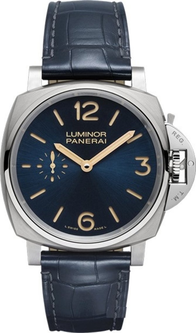 Корпус из титана, выполненный в форме подушки, хранит внутри себя автоматический мануфактурный калибр Р.4000, разработанный Officine Panerai. С помощью данного механизма на сатинированном циферблате синего цвета происходит индикация часов, минут и секунд. Сверхпрочное сапфировое стекло с двойным антибликовым покрытием защищает этот циферблат от повреждений разного характера. В комплекте к модели Due 3 Days 42 mm идет ремешок синего цвета из кожи аллигатора. Ремешок ручной работы. Механизм отличается трехдневным запасом хода. Стрелки созданы из золота. Часовые метки со стрелками покрыты люминесцентным покрытием, обеспечивающим доступную читабельность данных в темном помещении или в темное время суток.