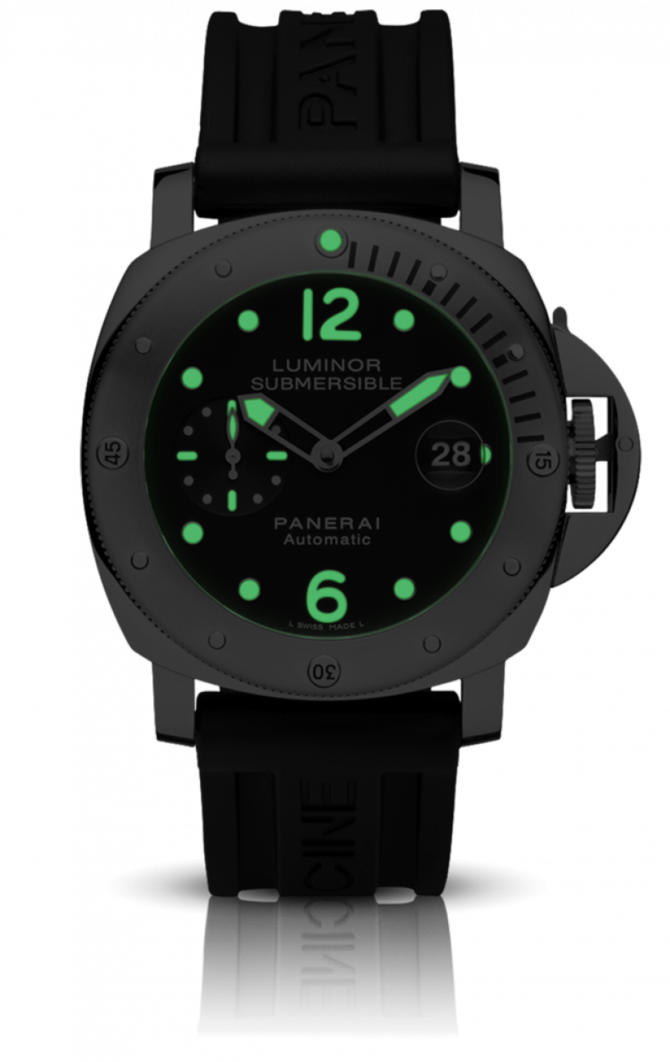 Функции: на черном циферблате, характерном для Officine Panerai, с нанесением люминесцентного покрытия, светящегося в темноте, и защищенном сапфировым стеклом, указываются часы, минуты, дата и секунды малой стрелкой, вынесенной в зону "9 часов", а также расчет времени погружения. Механизм: механика с автоматическим подзаводом, мануфактурный калибр на 21 камне, с балансовой частотой 28 800 полуколебаний/час и 42-часовым запасом хода, баланс из уникального запатентованного сплава Glucydur®, специальное противоударное устройство Incabloc®, калибр сертифицирован C.O.S.C. в качестве хронометра. Двигатель наручных часов помещен в подушкообразный массивный корпус из нержавеющей стали, диаметром 44 миллиметра. Задняя крышка также стальная, зафиксирована стальными винтами. Обратите внимание, что уникальное устройство защиты заводной головки запатентовано компанией Officine Panerai и характерно лишь для этой торговой марки. Модель обладает дайверской герметичностью (водонепроницаемостью) корпуса в 300 метров (30 бар).