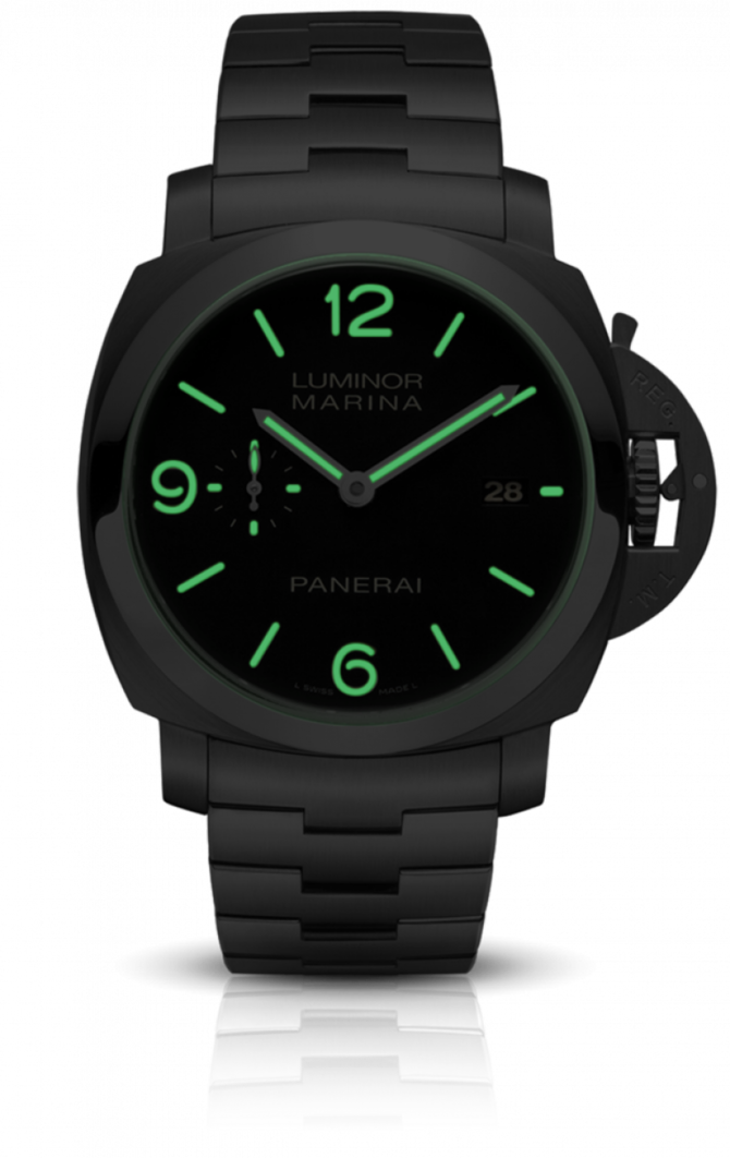 Швейцарские наручные часы, пополнившие коллекцию Luminor, представлены итальянско-швейцарской часовой маркой Officine Panerai в корпусе из полированной нержавеющей стали. Корпус выполнен в форме подушки. На светящемся в темноте циферблате часов указываются часы, минуты, секунды и дата. Механизм, приводящий модель в действие, с автоматическим подзаводом, мануфактурный, с противоударным устройством и 3-дневным запасом хода; обладает двумя заводными барабанами. Диаметр корпуса - 44 миллиметра. Задняя крышка корпуса из прозрачного сапфирового стекла. Одна из достопримечательностей корпуса - дайверская герметичность в 300 метров (30 бар). Корпус представленных часов - образец прочности, надежности и водонепроницаемости. Устройство защиты заводной головки запатентовано компанией Officine Panerai. Модель укомплектована прочным стальным браслетом из нержавеющей стали. Всегда часы Panerai, предназначенные для Военно-морского флота Италии, производились из нержавеющей стали.