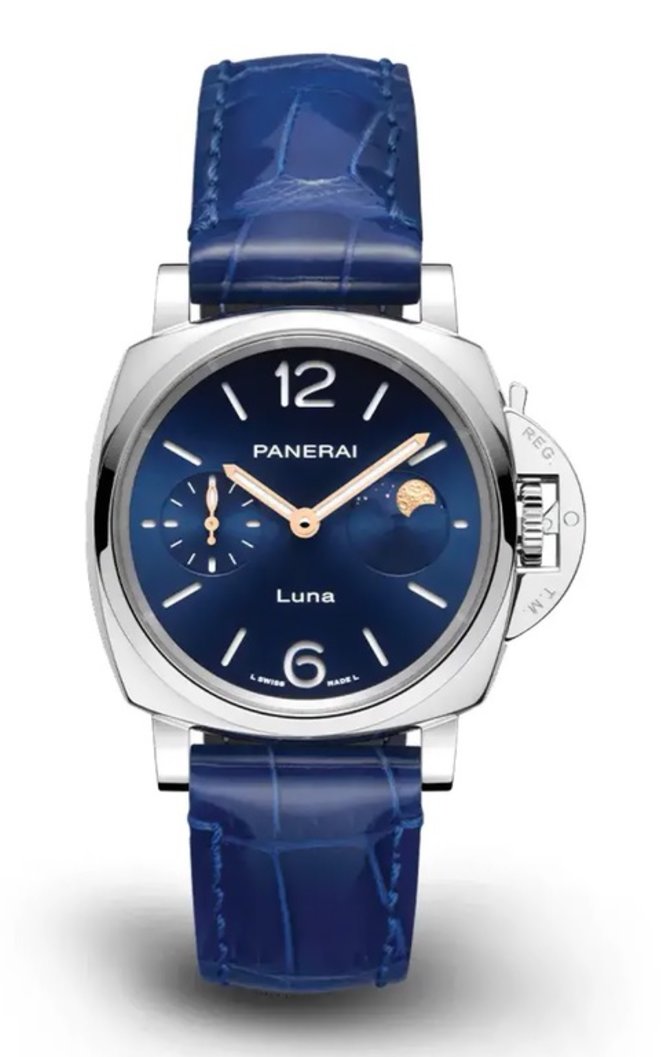 Предлагаем новинку в модельном ряду коллекции Luminor от компании Panerai. Женские часы Luminor Due Luna PAM01179 выполнены в 38-миллиметровом корпусе из полированной стали. Синий многослойный циферблат украшен солнечным сатинированием. Осложнение, расположенное в положении «3 часа», представляет собой диск, вращающийся с луной из золота на фоне звездного голубого неба. Часы комплектуются ремешком из кожи аллигатора синего цвета. Модель водонепроницаема при давлении до 3 бар (30 метров) и оснащена системой быстрого отсоединения. Автоматический механизм P.900/MP характеризуется 72-часовым запасом автономной работы.
