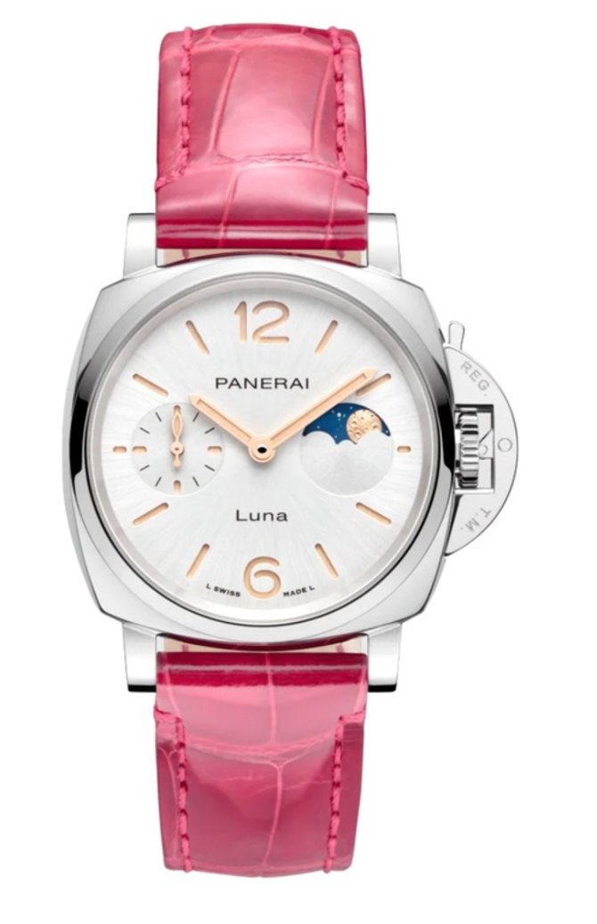 Благодаря строгим пропорциям и четкому стилю, новинка Luminor Due Luna PAM01180 переосмысливает форму и особенности культовой коллекции Luminor от компании Panerai. Доступные в 38-миллиметровом корпусе из полированной стали часы обещают стать ключевой опорой семейства Luminor Due. В данном варианте усложнение, расположенное в положении «3 часа», представляет собой диск, вращающийся с луной из золота на фоне звездного голубого неба. Циферблат серебристого цвета с радиальным "солнечным" сатинированием. Стрелки сделаны из розового золота. Часы водонепроницаемы до 3 бар (30 метров). Система быстрого отсоединения ремешка позволяет менять его без использования инструментов. Ремешок розового цвета пошит из кожи аллигатора. Автоматический механизм P.900/MP обладает 72-часовым запасом автономной работы.