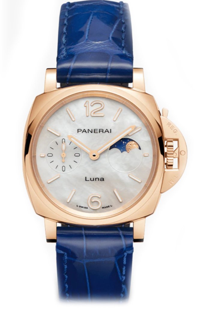 Компания Panerai представила новинку коллекции Luminor - женские наручные часы Luna Goldtech PAM01181. Корпус модели изготовлен из розового золота Goldtech™, диаметром 38 мм. На перламутровом циферблате в положении "9 часов" расположен малый секундный циферблат, на "3 часах" – индикатор фаз Луны. Осложнение представляет собой диск, вращающийся с луной из золота 24 карата на фоне звездного голубого неба. Часы комплектуются ремешком из кожи аллигатора синего цвета. Модель водонепроницаема до 5 бар (50 метров), оснащена системой быстрого отсоединения ремешка. Запас хода наручных часов рассчитан на 72 часа работы без подзавода. Защитное лицевое стекло выполнено из сапфирового кристалла с антибликовым составом.