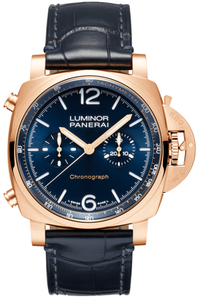 Спортивные наручные часы Officine Panerai Luminor Chrono Blu Notte PAM1111 функционируют на базе мануфактурного механизма с автоподзаводом, хронографом и 42-часовым запасом хода - калибр P.9200. Подушкообразный корпус, размером 44 х 15.1 мм, выполнен из розового золота и дополнен ремнем из кожи аллигатора с застежкой из золота для фиксации часов на руке. Под выпуклым защитным сапфировым стеклом с противобликовым эффектом показываются данные текущего времени, а также расположена тахиметрическая шкала. На золотые стрелки нанесен люминесцентный состав для считывания данных в темноте. Заводной ключ защищен запатентованной Officine Panerai фирменной защитой. Корпус имеет50-метровую герметичность.