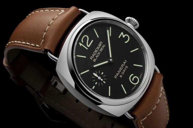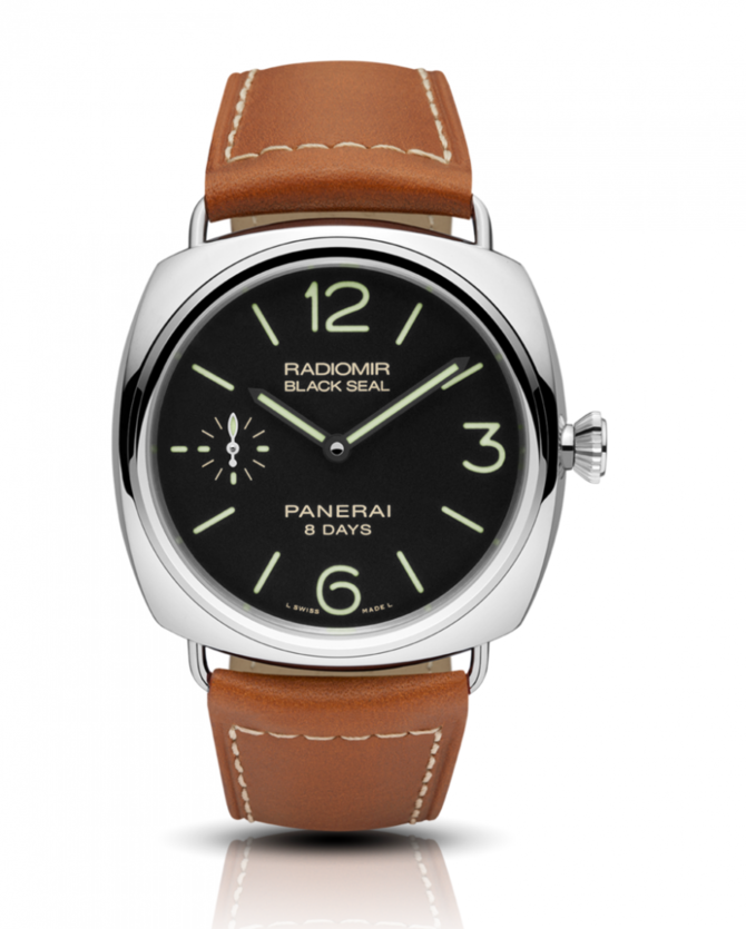Известная итальянская компания Panerai, производящая свои часовые изделия в Швейцарии, пополнила коллекцию Radiomir наручными часами BLACK SEAL 8 DAYS ACCIAIO в подушкообразном корпусе из полированной стали со съемными проволочными ушками, запатентованными брендом Panerai. Диаметр корпуса - 45 миллиметров. Задняя крышка корпуса часов произведена из сапфирового стекла. Часовой циферблат черного цвета со светящимися в темноте цифрами и часовыми метками. Герметичность корпуса - 100 метров (10 бар). Ремешок пошит из телячьей кожи и наделен классической застежкой. Механический механизм с ручным заводом, на 21 драгоценном камне, баланс из сплава Glucydur®, 21 600 полуколебаний/час с противоударным устройством KIF Parechoc®. Запас хода механизма - 8 дней. Механизм с двумя заводными барабанами.