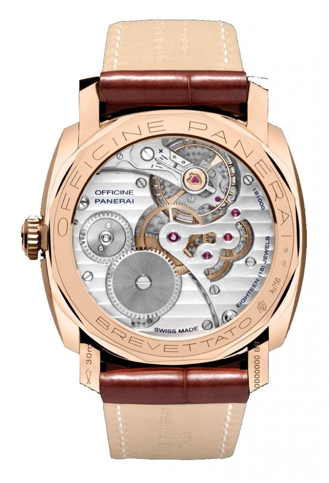 Мастера компании Officine Panerai представили часы из красного золота, созданную по мотивам часов 40-ых годов. Компания использовала особый подход к выбору и обработке материала, из которого выполнены наручные часы Radiomir 1940 Oro Rosso (Ref: РАМ00398).