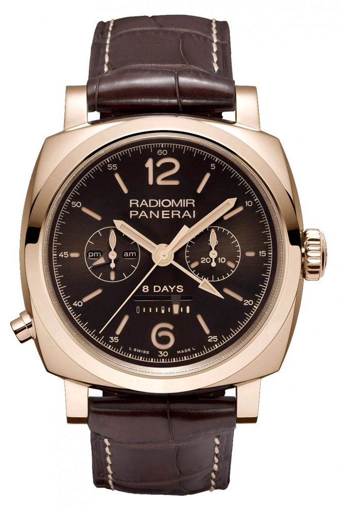 головки. В результате получился прочный и функциональный корпус, воплощающий благородную сдержанность и изысканную элегантность. Корпус из красного золота диаметром 45 мм оснащен заводной головкой цилиндрической формы с рельефным логотипом Officine Panerai и единственной кнопкой в положении «8 часов», с помощью которой регулируются все функции хронометра. Модель из красного золота (PAM00502) оснащена коричневым циферблатом с сатинированной отделкой «солнечные лучи» и большими цифрами и часовыми метками в форме палочек, что является отличительной особенностью дизайна Panerai, начиная с самых первых часов, произведенных компанией. Часы предлагаются с коричневым ремешком из крокодиловой кожи с регулируемой пряжкой из того же материала, что и корпус. Модель обладает водонепроницаемостью до пяти атмосфер (около 50 метров).