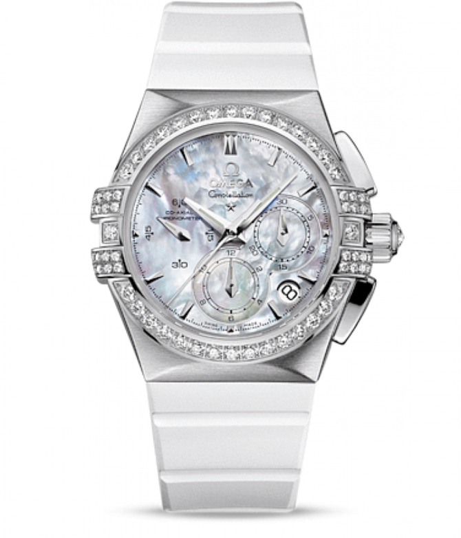 Эффектный дизайн часов OMEGA Constellation прошел проверку временем. Характерной особенностью стали знаменитые скобки по бокам часового корпуса и впечатляющие циферблаты. Модель имеет белый перламутровый циферблат с 30-минутным и 12-часовым счетчиками, малой секундной стрелкой, окошком указателя даты и устойчивым к царапинам сапфировым стеклом. Украшенный бриллиантами безель закреплен на корпусе диаметром 35 мм из нержавеющей стали, который дополнен белым каучуковым ремешком. В этой модели используется коаксиальный часовой механизм, калибр 3313, который виден сквозь сапфировое стекло задней крышки корпуса. Запас хода часов 52 часа. Водонепроницаемость - 100 метров.