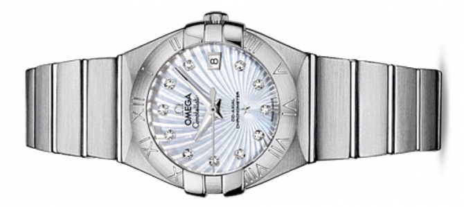 Эффектный дизайн часов OMEGA Constellation прошел проверку временем. Его характерной особенностью стали знаменитые скобки по бокам часового корпуса и впечатляющие циферблаты. Циферблат накрыт устойчивым к царапинам сапфировым стеклом. Модель имеет белый перламутровый циферблат с узором Supernova и бриллиантовыми часовыми метками. Безель с выгравированными римскими цифрами закреплен на корпусе диаметром 27 мм из нержавеющей стали. Часы дополняет браслет из нержавеющей стали. Запас хода - 50 часов. Часы герметичны и выдерживают давление в 10 бар (эквивалент глубины 100 метров). В этой модели используется коаксиальный часовой механизм OMEGA, калибр 8520, который виден сквозь прозрачную заднюю крышку корпуса.