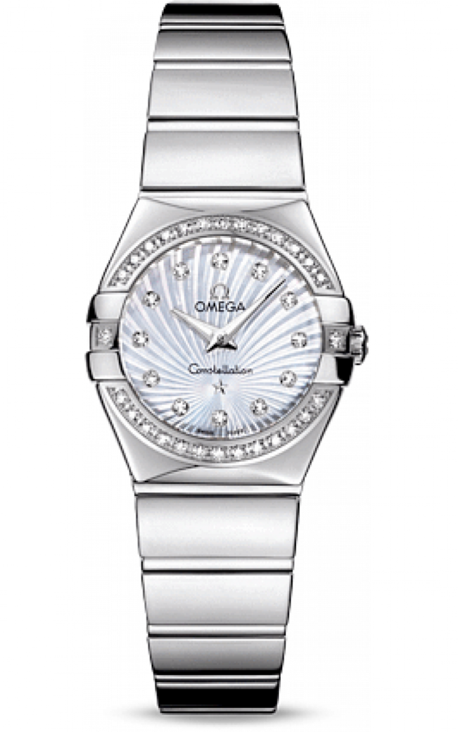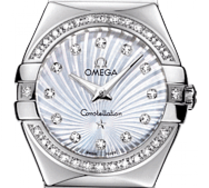 Эффектный дизайн часов OMEGA Constellation прошел проверку временем. Эта полированная модель имеет белый перламутровый циферблат с узором Supernova и бриллиантовыми часовыми метками. Украшенный бриллиантами безель закреплен на корпусе диаметром 24 мм из нержавеющей стали, который дополнен стальным браслетом. Часы дополняет браслет из нержавеющей стали. В этих часах используется высокоточный кварцевый механизм с родиевым покрытием OMEGA, калибр 1376. Часы водостойкие, можно погружаться на глубину до 100 метров. Запас хода часов - 41 день.