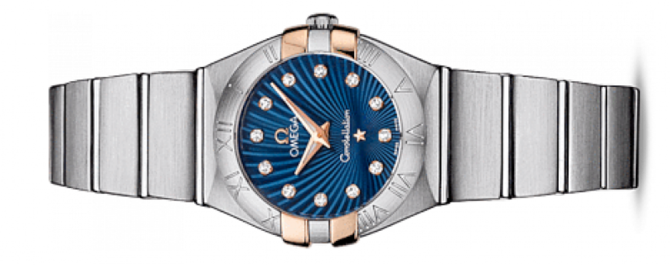 Необычайно эффектный дизайн часов Constellation прошел проверку временем. Скобки по бокам часового корпуса изготовлены из 18-кратного розового золота. Эта сатинированная модель имеет синий циферблат с узором Supernova c бриллиантовыми часовыми метками. Циферблат накрыт устойчивым к царапинам сапфировым стеклом. Запас хода часов - 41 месяц. Часы водостойкие, можно погружаться на глубину до 100 метров. На безели из нержавеющей стали выгравированные римские цифры. Он закреплен на корпусе диаметром 24 мм из нержавеющей стали. Часы дополняет браслет из нержавеющей стали. В этих часах используется высокоточный кварцевый механизм OMEGA, калибр 1376.