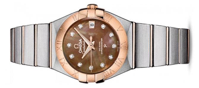Безель из 18-каратного розового золота. На нем выгравированные римские цифры. Корпус диаметром 27 мм из нержавеющей стали, который дополнен браслетом из нержавеющей стали и 18-каратного розового золота. В этой модели используется коаксиальный часовой механизм OMEGA, калибр 8520, который виден сквозь прозрачную заднюю крышку корпуса. Модель имеет коричневый перламутровый циферблат с бриллиантовыми часовыми метками. Циферблат накрыт устойчивым к царапинам сапфировым стеклом с антибликовым покрытием изнутри. Часы герметичны и выдерживают давление в 10 бар (эквивалент глубины 100 метров). Запас хода - 50 часов.