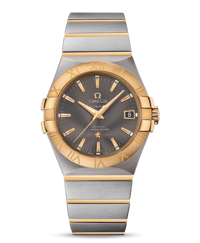 Изящные швейцарские женские наручные механические часы Co-Axial 35 mm, созданные легендарной часовой компанией Omega, внутри круглого тридцати пяти миллиметрового корпуса из нержавеющей стали и желтого 18-каратного золота содержат автоматический мануфактурный коаксиальный механизм, Калибр Omega 2500, с двухсуточным запасом хода. Модель пополнила широкий часовой ассортимент коллекции Constellation. Необычайно эффектный дизайн этой часовой линии прошел проверку временем. Важно, что механизм этих часов имеет официальный сертификат швейцарского института тестирования хронометров COSC. На циферблате модели расположены указатели часов, минут, секунд и даты. Корпус герметичен до 100-метровой глубины. Безель с выгравированными римскими цифрами. Браслет из нержавеющей стали и желтого золота с раскладывающейся застежкой.