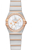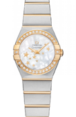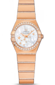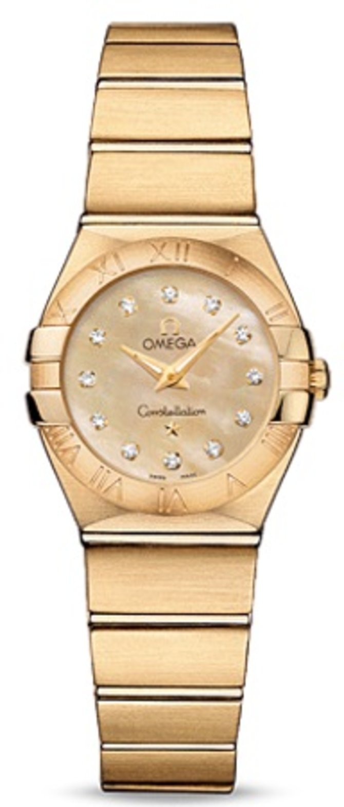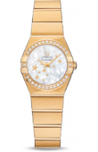 В этих часах используется высокоточный кварцевый механизм OMEGA, калибр 1376. Часы водостойкие, можно погружаться на глубину до 100 метров. Эта сатинированная модель имеет перламутровый циферблат цвета шампанского c бриллиантовыми часовыми меткам. Циферблат накрыт устойчивым к царапинам сапфировым стеклом. На безеле выгравированные римские цифры. Он закреплен на корпусе диаметром 24 мм из 18-каратного желтого золота. Часы дополняет браслет из 18-каратного желтого золота.