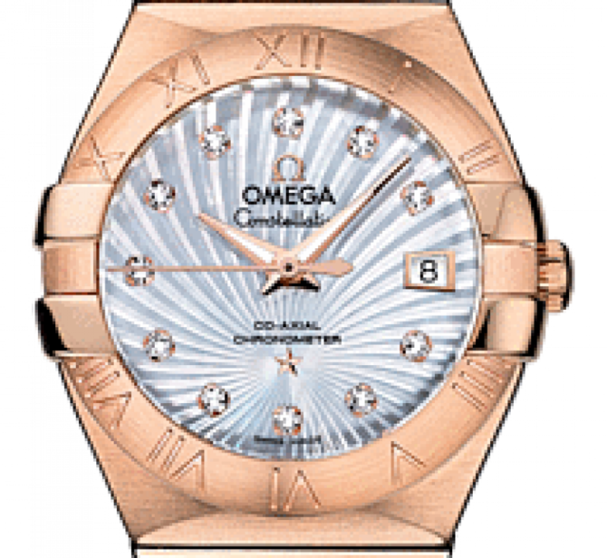 Эта модель имеет белый перламутровый циферблат с узором Supernova и бриллиантовыми часовыми метками. Безель с выгравированными римскими цифрами закреплен на корпусе диаметром 27 мм из 18-каратного розового золота. Циферблат накрыт устойчивым к царапинам сапфировым стеклом с антибликовым покрытием изнутри. Основу этих часов составляет коаксиальный часовой механизм OMEGA, калибр 8521, который виден сквозь прозрачную заднюю крышку корпуса. Часы дополняет браслет из 18-каратного розового золота. Часы герметичны и выдерживают давление в 10 бар (эквивалент глубины 100 метров). Запас хода - 50 часов.