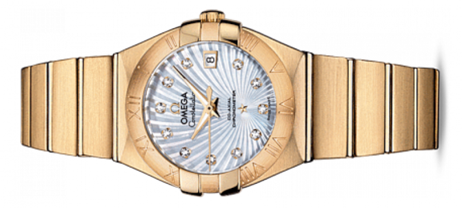 Эффектный дизайн часов OMEGA Constellation прошел проверку временем. Эта сатинированная модель имеет белый перламутровый циферблат с узором Supernova и бриллиантовыми часовыми метками. Циферблат накрыт устойчивым к царапинам сапфировым стеклом с антибликовым покрытием изнутри. Безель с выгравированными римскими цифрами закреплен на корпусе диаметром 27 мм из 18-каратного желтого золота. Основу этих часов составляет коаксиальный часовой механизм OMEGA, калибр 8521, который виден сквозь прозрачную заднюю крышку корпуса. Часы дополняет браслет из 18-каратного желтого золота. Запас хода - 50 часов. Часы герметичны и выдерживают давление в 10 бар (эквивалент глубины 100 метров).
