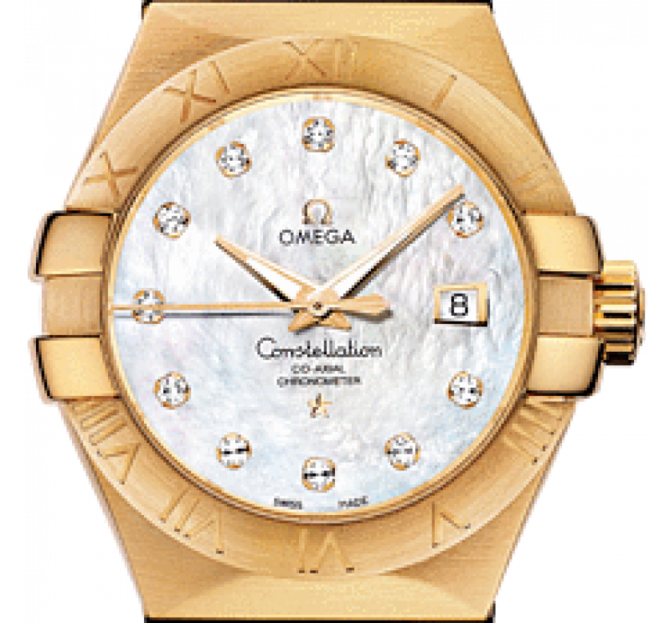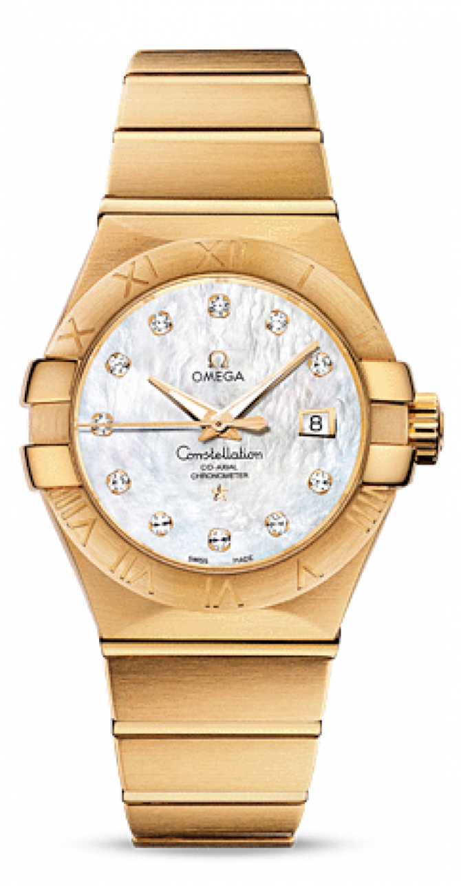 Эта модель имеет белый перламутровый циферблат. Окошко указателя даты в положении «3 часа». Устойчивое к царапинам сапфировое стекло с антибликовым покрытием. В модели используется коаксиальный часовой механизм. Его видно сквозь сапфировое стекло задней крышки корпуса. Характерной особенностью стали скобки по бокам часового корпуса и циферблаты. Безель с выгравированными римскими цифрами закреплен на корпусе диаметром 31 мм из 18-каратного желтого золота. Часовые отметки выполнены из бриллиантов. Часы дополняет браслет из 18-каратного желтого золота. Герметичность часов - 100 метров. Запас хода - 50 часов.