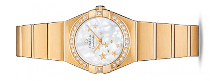 Корпус диаметром 24 мм из 18-кратного желтого золота, который дополнен браслетом из 18-кратного желтого золота. Часы водостойкие, можно погружаться на глубину до 100 метров. Эта сатинированная модель имеет белый перламутровый циферблат с россыпью накладных позолоченных звезд. Он накрыт устойчивым к царапинам сапфировым стеклом. Украшенный бриллиантами безель из 18-кратного желтого золота. В этих часах используется высокоточный кварцевый механизм OMEGA, калибр 1376. Запас хода часов - 41 месяц.