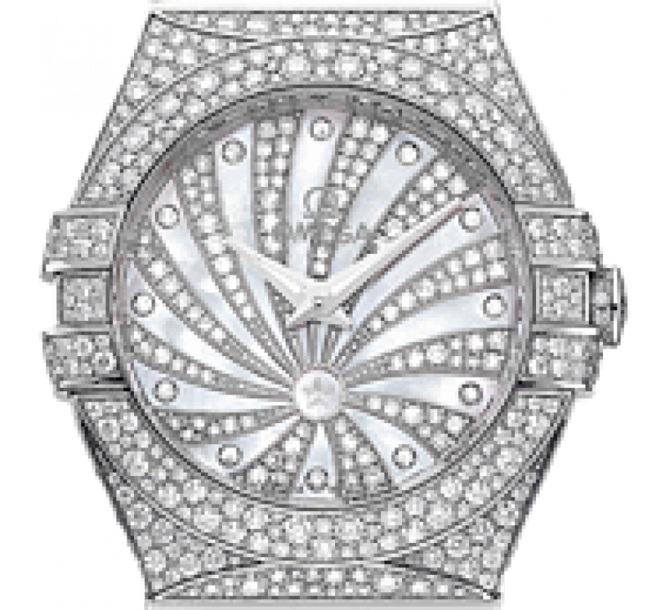 Корпус диаметром 24 мм из 18-каратного белого золота с золотым безелем дополнен браслетом из 18-каратного белого золота. Безель, корпус и звенья браслета украшены паве из разноразмерных бриллиантов. В этих часах с 1762 бриллиантами используется высокоточный кварцевый механизм с родиевым покрытием OMEGA, калибр 1376. Эта роскошная модель имеет украшенный бриллиантами циферблат из 18-каратного белого золота с белым перламутровым узором Supernova. Циферблат накрыт устойчивым к царапинам сапфировым стеклом с антибликовым покрытием. Часы водостойкие, можно погружаться на глубину до 100 метров. Запас хода часов - 41 день.
