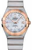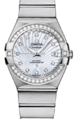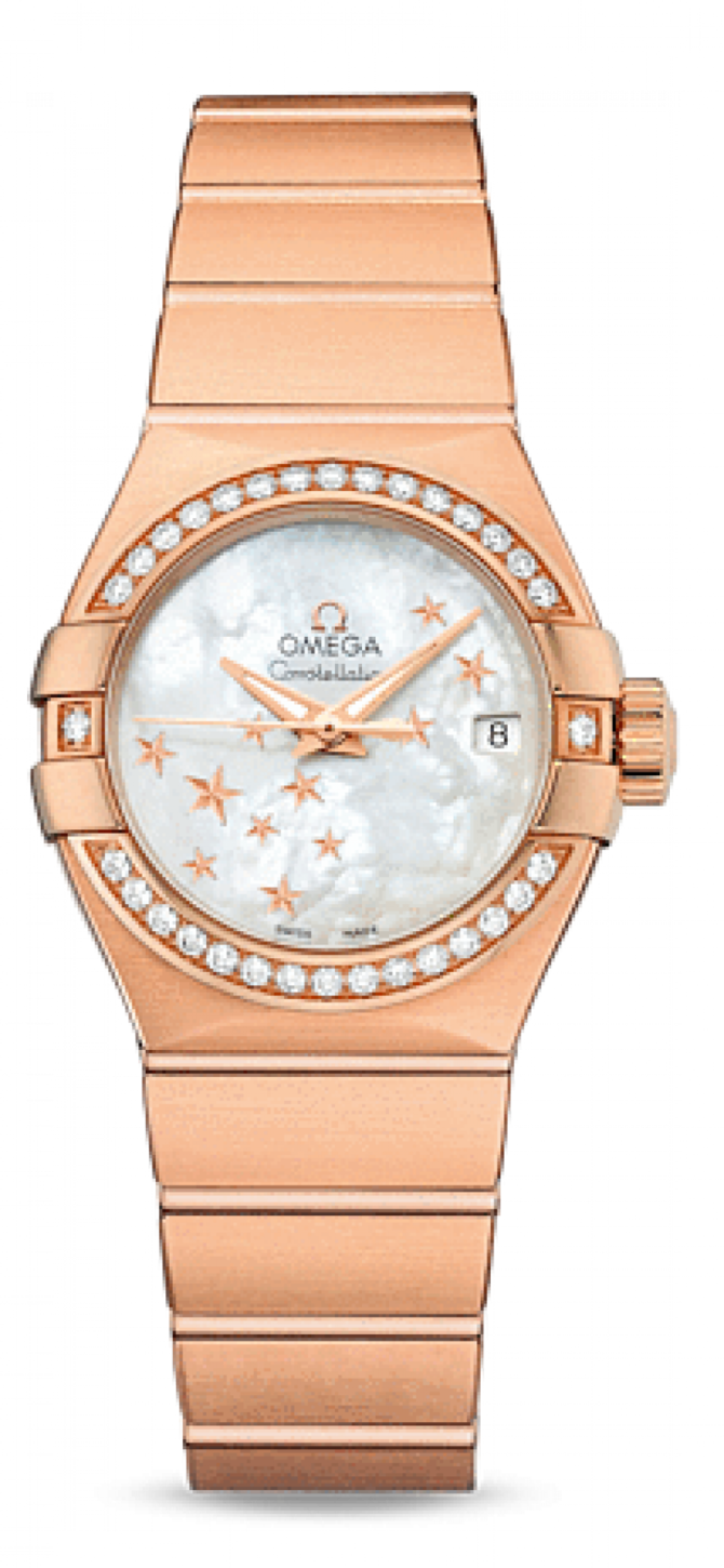 Эффектный дизайн часов OMEGA Constellation прошел проверку временем. Характерной особенностью стали знаменитые скобки по бокам часового корпуса и впечатляющие циферблаты. Cатинированная модель имеет белый перламутровый циферблат с россыпью накладных позолоченных звезд. Он накрыт устойчивым к царапинам сапфировым стеклом с антибликовым покрытием. Украшенный бриллиантами безель закреплен на корпусе диаметром 27 мм из 18-каратного розового золота, который дополнен браслетом из 18-каратного розового золота. Основу этих часов составляет коаксиальный часовой механизм OMEGA, калибр 8521, который виден сквозь прозрачную заднюю крышку корпуса. Часы герметичны и выдерживают давление в 10 бар (эквивалент глубины 100 метров).