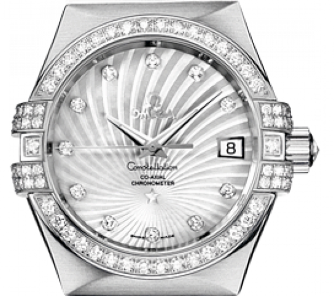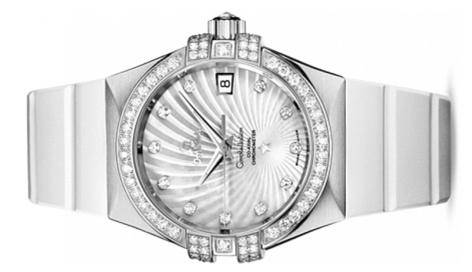 Необычайно эффектный дизайн часов OMEGA Constellation прошел проверку временем. Эта модель имеет белый перламутровый циферблат с узором Supernova. Окошко указателя даты в положении «3 часа», бриллиантовыми часовыми метками. Циферблат накрыт устойчивым к царапинам сапфировым стеклом. Украшенный бриллиантами безель с бриллиантами на скобках. Он закреплен на полированном корпусе диаметром 35 мм из 18-каратного белого золота. Основу этих часов составляет коаксиальный часовой механизм, калибр 2500, который виден сквозь прозрачную заднюю крышку корпуса. Часы дополняет белый каучуковый ремешок. Герметичность: 10 бар (100 метров). Запас хода: 48 часов.