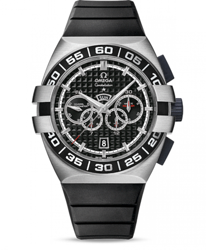 Характерной особенностью стали знаменитые скобки по бокам часового корпуса и впечатляющие циферблаты. Эта модель имеет черный циферблат с 30-минутным, 12-часовым и 7-дневным счетчиками, малой секундной стрелкой, окошком указателей дня недели и даты. Циферблат накрыт выпуклым, устойчивым к царапинам сапфировым стеклом с двусторонним антибликовым покрытием. Черный алюминиевый безель закреплен на корпусе диаметром 44 мм из нержавеющей стали, который дополнен черным каучуковым ремешком. В этих часах с черными обрезиненными кнопками и заводной головкой используется коаксиальный часовой механизм, калибр 3890, который виден сквозь прозрачную заднюю крышку корпуса. Запас хода часов 52 часа. Водонепроницаемость - 100 метров.