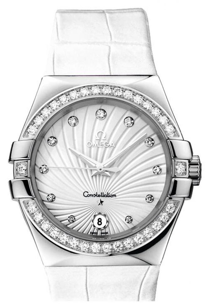 Необычайно эффектный дизайн часов OMEGA Constellation прошел проверку временем. Его характерной особенностью стали знаменитые скобки по бокам часового корпуса и впечатляющие циферблаты. Эта модель имеет белый циферблат с узором Supernova, окошком указателя даты в положении «6 часов», бриллиантовыми часовыми метками и устойчивым к царапинам сапфировым стеклом. Украшенный бриллиантами безель закреплен на корпусе диаметром 35 мм из нержавеющей стали, который дополнен белым кожаным ремешком. Основу этой модели составляет кварцевый часовой механизм OMEGA, калибр 1532.