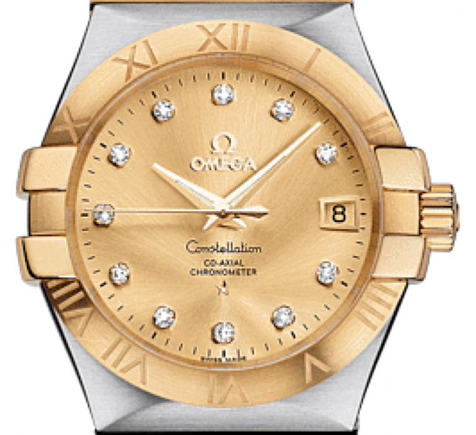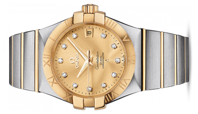 Необычайно эффектный дизайн часов OMEGA Constellation прошел проверку временем. Его характерной особенностью стали знаменитые скобки по бокам часового корпуса и впечатляющие циферблаты. Циферблат цвета шампанского украшенный бриллиантовыми часовыми метками. Окошком указателя даты в положении «3 часа». Циферблат накрыт устойчивым к царапинам сапфировым стеклом. Безель из 18-каратного желтого золота закреплен на корпусе диаметром 35 мм из нержавеющей стали. На безели выгравированные римские цифры. Браслет из нержавеющей стали и 18-каратного желтого золота. В этой модели используется коаксиальный часовой механизм, калибр 2500, который виден сквозь сапфировое стекло задней крышки корпуса. Запас хода: 48 часов. Герметичность: 10 бар (100 метров / 330 футов).