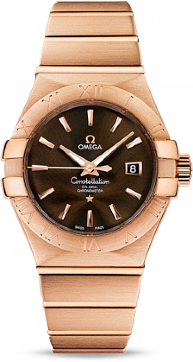 Эффектный дизайн часов OMEGA Constellation прошел проверку временем. Его характерной особенностью стали знаменитые скобки по бокам часового корпуса и впечатляющие циферблаты. Эта модель имеет коричневый циферблат с окошком указателя даты в положении «3 часа» и устойчивым к царапинам сапфировым стеклом. Безель с выгравированными римскими цифрами. Корпус диаметром 31 мм из 18-каратного розового золота. Часы дополняет браслет из 18-каратного розового золота. Основа этих часов - коаксиальный часовой механизм OMEGA, калибр 8521, который виден сквозь прозрачную заднюю крышку корпуса. Запас хода: 50 часов. Герметичность: 10 бар (100 метров / 330 футов).