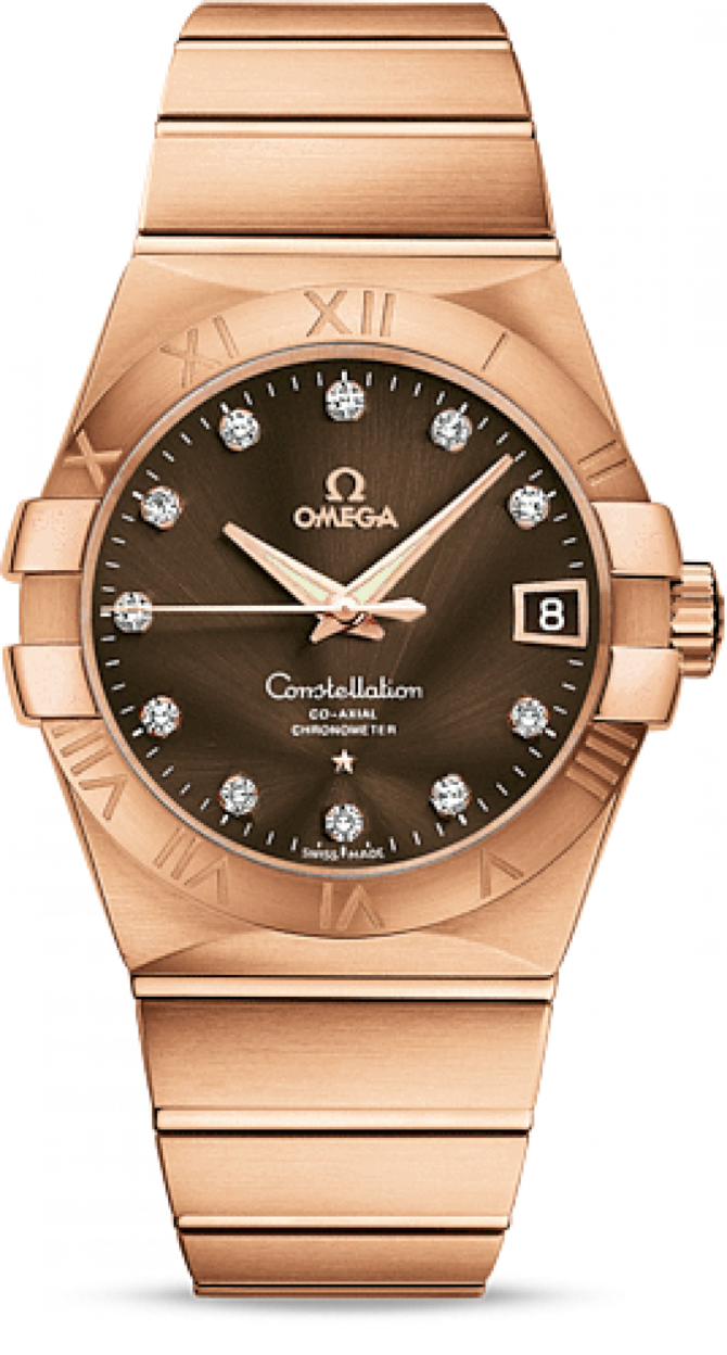 В этих изысканных часах используется коаксиальный часовой механизм OMEGA, калибр 8501, который виден сквозь прозрачную заднюю крышку корпуса. Необычайно эффектный дизайн часов OMEGA Constellation прошел проверку временем. Его характерной особенностью стали знаменитые скобки по бокам часового корпуса и впечатляющие циферблаты. Эта модель имеет украшенный бриллиантовыми часовыми метками коричневый циферблат с окошком указателя даты в положении «3 часа» и устойчивым к царапинам сапфировым стеклом. Безель с выгравированными римскими цифрами закреплен на корпусе диаметром 38 мм из 18-каратного розового золота. Часы дополняет браслет из 18-каратного розового золота. Глубина погружения в воду 100 метров. Запас хода - 60 часов.