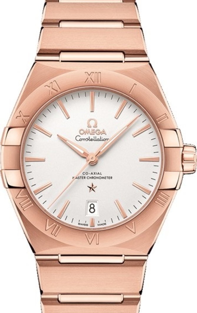 В корпусе из полированного 18-каратного розового золота, диаметром всего 39 мм, брендом Omega представлена модель швейцарских часов Constellation Co-Axial Master Chronometer 39 mm 131.50.39.20.02.001. На безеле из розового золота выгравирована римская часовая разметка. На элегантном циферблате белого цвета с золотыми метками и стрелками показываются данные часов, минут и секунд, а также даты благодаря автоматическому мануфактурному калибру 8801 с запасом хода на 55 часов. Также отметим, что установленный механизм отличается сертификатом хронометра COSC. Корпус имеет повышенную герметичность - 50 метров. Сапфировое стекло защищает циферблат от повреждений. На руке модель фиксируется браслетом из розового золота с раскладной пряжкой. Год выпуска элегантных часов - 2019.
