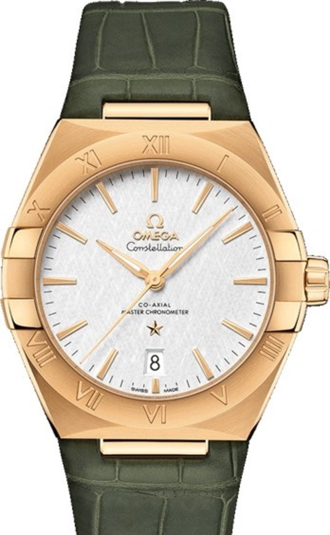 Швейцарские часы Omega Constellation Co-Axial Master Chronometer 39 mm 131.53.39.20.02.002 оснащены механизмом 8801 с автоподзаводом, который отвечает за индикацию времени и даты. Также механизм отмечен сертификатом хронометра COSC. Круглый корпус сделан из желтого золота. Безель с гравировкой в виде римской разметки. Стрелки и часовая разметка из желтого золота покрыты люминесцентным покрытием. За безопасность циферблата отвечает установленное сапфировое стекло с противобликовым составом. В комплекте идет ремешок из кожи аллигатора зеленого цвета. Задняя крышка также из сапфирового стекла. Год выпуска - 2019.