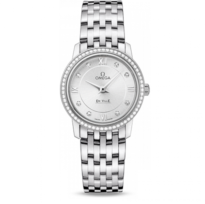 Коллекция OMEGA De Ville Prestige завоевала любовь поклонников бренда своим классическим элегантным дизайном. Входящие в нее модели отличаются чистотой линий, роскошной отделкой и вневременным дизайном. Данная модель имеет серый циферблат с делением на две зоны, с бриллиантовыми часовыми метками и выполненными из золота римскими цифрами в положениях «3 часа», «6 часов», «9 часов» и «12 часов». Эффектный циферблат защищен устойчивым к царапинам сапфировым стеклом. Корпус диаметром 27,4 мм из нержавеющей стали с браслетом из того же материала дополнен украшенным бриллиантами безелем из стали. В этой модели используется высокоточный кварцевый механизм OMEGA, калибр 1376. Часы сохраняют свою водонепроницаемость на глубине до 30 метров. Запас хода часового механизма данной модели часов весьма внушительный - 41 месяц.