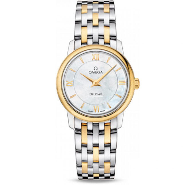 OMEGA De Ville Prestige завоевала любовь поклонников бренда своим классическим элегантным дизайном. Входящие в нее модели отличаются чистотой линий, роскошной отделкой и вневременным дизайном. В этой модели используется высокоточный кварцевый механизм OMEGA, калибр 1376. Запас хода часового механизма данной модели часов весьма внушительный - 41 месяц. Эффектный циферблат защищен устойчивым к царапинам сапфировым стеклом. Данная модель имеет белый перламутровый циферблат с делением на две зоны, с выполненными из золота римскими цифрами в положениях «3 часа», «6 часов», «9 часов» и «12 часов». Корпус диаметром 27,4 мм из нержавеющей стали с браслетом из нержавеющей стали и 18-каратного желтого золота дополнен безелем из 18-каратного желтого золота. Часы сохраняют свою водонепроницаемость на глубине до 30 метров.